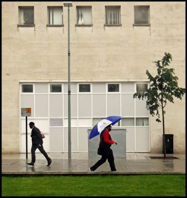I remember this from another forum and its composition and 'frozen' activity keeps drawing your eye around the picture. The two figures going hurriedly in opposite directions intent on getting out of the rain asap and that splash of colour just adds something. There are several geometric connections going on as well. The rectangles of the building and bins, but the triangulation of the tree, the no-waiting sign ad the top of the lampost gets stronger the more you look.