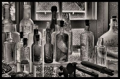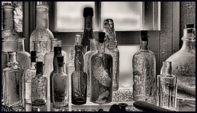 Where as in the original version, the angle of brick work and architectural detail beyond pause the eyes, and then I am back looking at the objects in the foreground, before the bottles (for a second time).